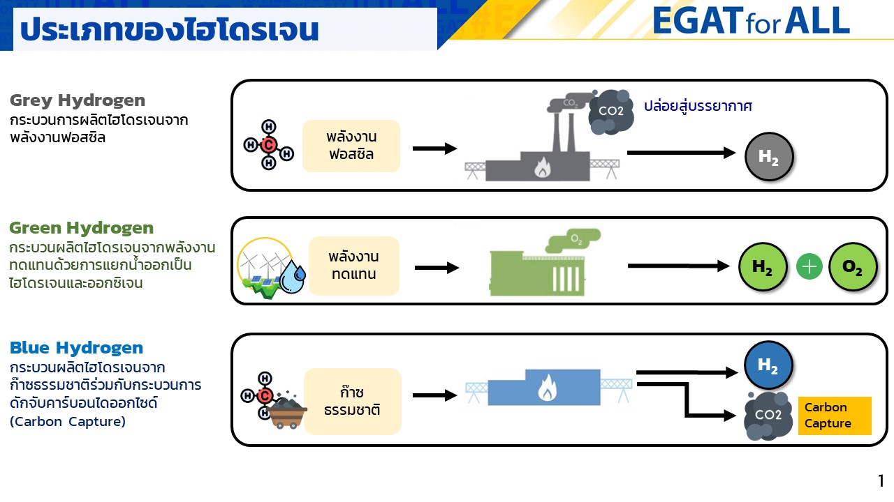 และเพื่อให้ง่ายต่อการจดจำถึงการนำไฮโดรเจนมาใช้ประโยชน์ในทางสากลได้ จึงมีการจำแนกไฮโดรเจนออกเป็นสีต่างๆ ตามกระบวนการในการผลิต ที่สำคัญคือ ไฮโดรเจนสีเทา (Grey Hydrogen) ที่เป็นการผลิตโดยใช้เชื้อเพลิงฟอสซิล เช่น ก๊าซธรรมชาติหรือถ่านหิน ซึ่งจุดด้อยของไฮโดรเจนสีเทาคือในกระบวนการผลิตจะมีการปล่อยคาร์บอนไดออกไซด์ (CO2) สู่ชั้นบรรยากาศ ถัดมาคือ ไฮโดรเจนสีน้ำเงิน (Blue Hydrogen) ซึ่งมีกระบวนการผลิตเช่นเดียวกับไฮโดรเจนสีเทา แต่แตกต่างกันตรงที่จะมีการกักเก็บคาร์บอนไดออกไซด์ (CCS : Carbon Capture and Storage) ที่ถูกปล่อยออกมาเอาไว้ และไฮโดรเจนสีเขียว (Green Hydrogen) คือ ไฮโดรเจนที่ผลิตขึ้นมาโดยใช้ไฟฟ้าจากแหล่งพลังงานสะอาด เช่น พลังงานลม หรือ แสงอาทิตย์ โดยจะจ่ายกระแสไฟฟ้าในกระบวนการแยกน้ำ (H2O) เป็นไฮโดรเจน (H2) และออกซิเจน (O2) ที่เรียกว่า Electrolysis